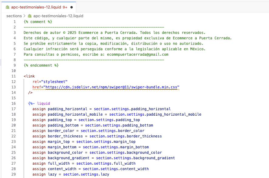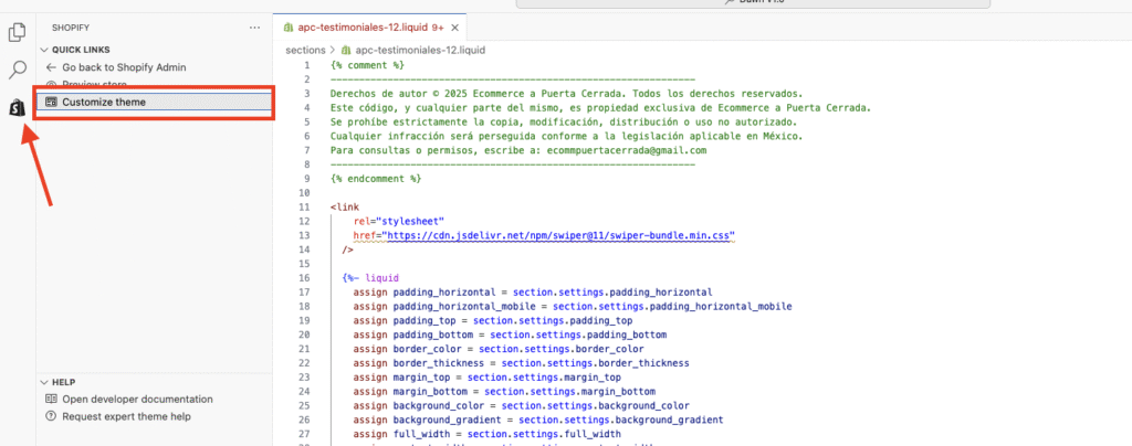 A continuación puedes copiar el código de la sección y copiarlo en tu tema de Shopify.